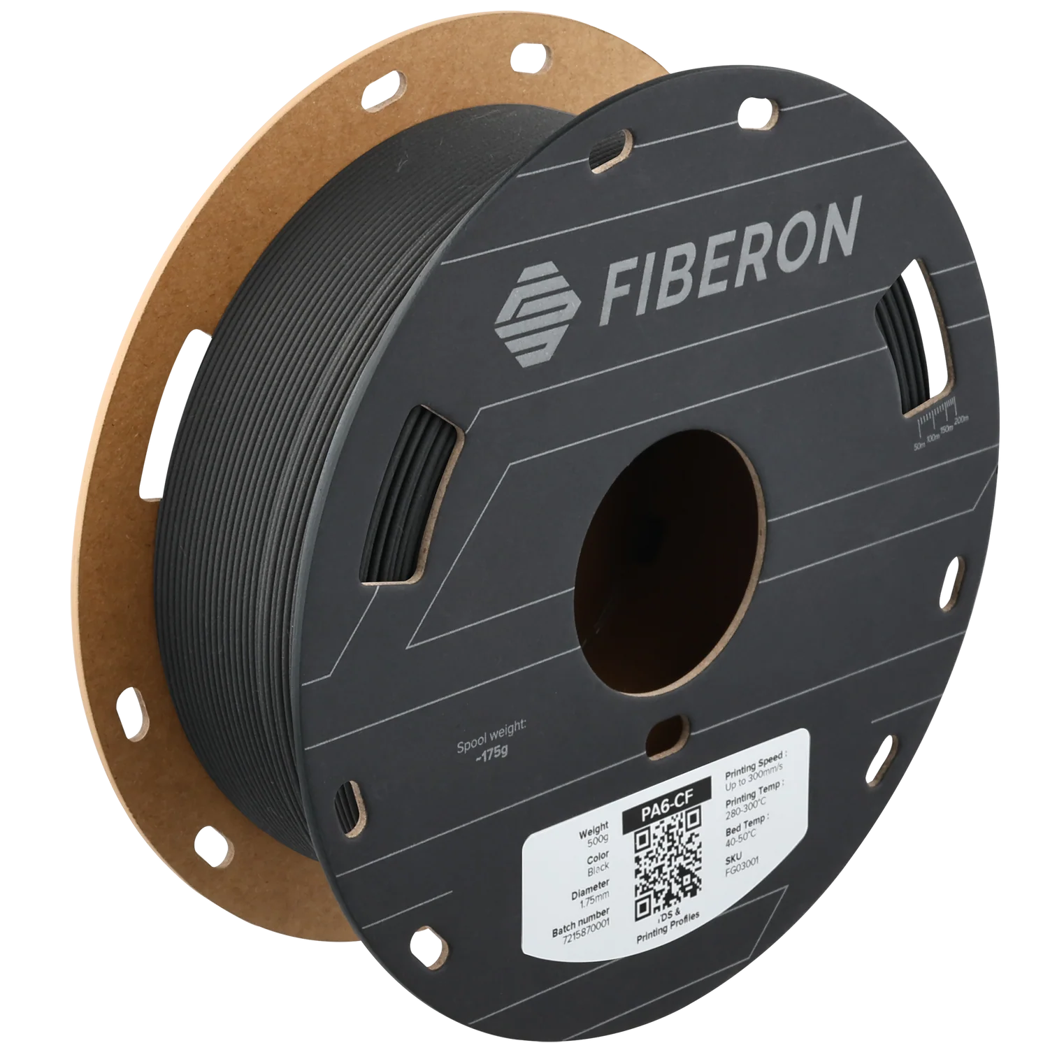 Fiberon™ PA6-CF20 е нишка от найлон 6, подсилена с 20% въглеродни влакна. Армировката от въглеродни влакна осигурява значително подобрена твърдост, здравина и устойчивост на топлина с изключителна адхезия на слоя благодарение на технологията Fiber Adhesion™. PA6-CF превъзхожда почти всички материали за 3D принтиране, като предлага изключителна издръжливост и функционалност, като същевременно се отличава с температура на топлинно отклонение от 215°C.