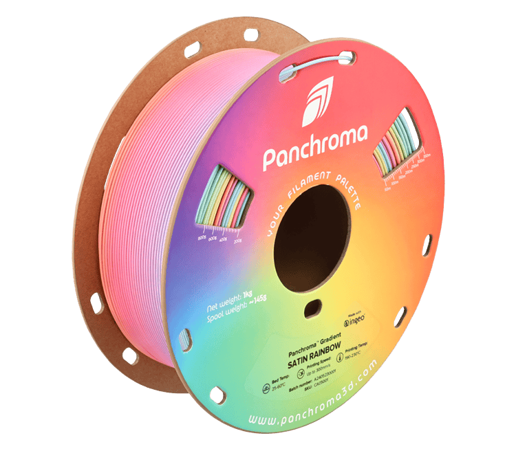 Panchroma™ Satin Rainbow PLA е нишка за 3D печат с цветови преход, която преминава между различни цветове и нюанси по време на работа на шпулата. Базиран на формулата Polymakers Satin PLA, този дъгов филамент съчетава в себе си лекота на използване, качество на печат, скорост и надеждност. Той е идеалният избор за лесно създаване на цветни или многоцветни модели с гладка сатенена повърхност, която скрива слоевете.