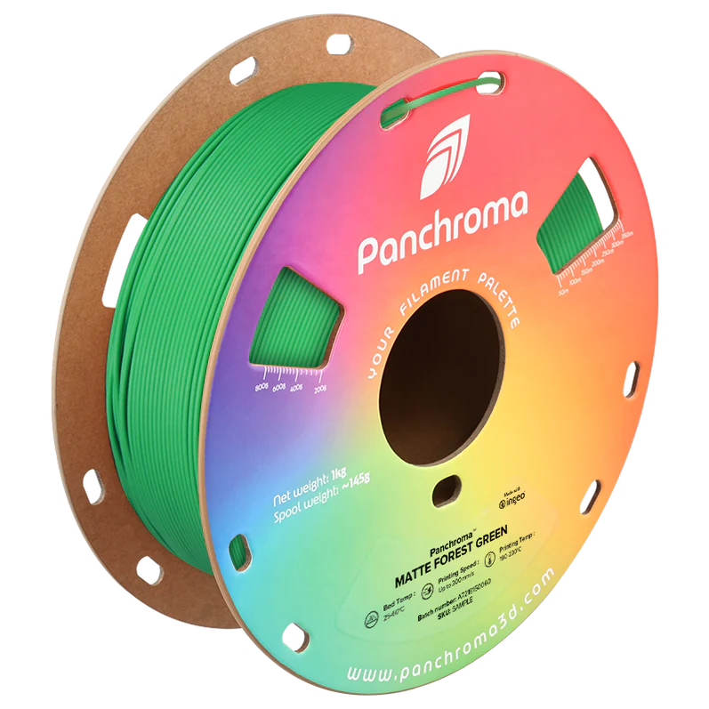 - Формула за биопластичен матов PLA – Panchroma™ PLA е базиран на новоразработен материал от Polymaker, наречен FBC (Fully Bio Compound). Това е съединение от висококачествен Ingeo PLA, допълнен с естествено срещащи се елементи. Резултатът е нишка PLA с по-малко съдържание на пластмаса, която се усеща по-мека и по-еластична/малко крехка на макарата. Формулата на Polymakers FBC съдържа по-малко PLA пластмаса за разграждане, което подобрява скоростта на разграждане при специфични индустриални условия. Подобно на други PLA, скоростта на разграждане все още е много бавна при температури на околната среда.