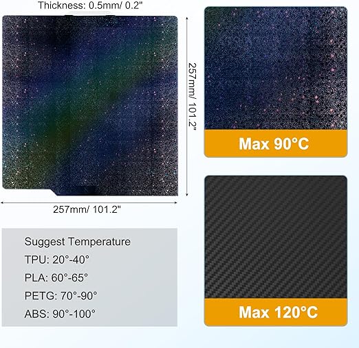 Устойчивост на висока температура: Повърхността на PET може да издържи на високи температури до 120°C. Работи добре с PLA, TPU, PETG. Размер: 257 мм дължина х 257 мм ширина, дебелина: 0,5 мм.