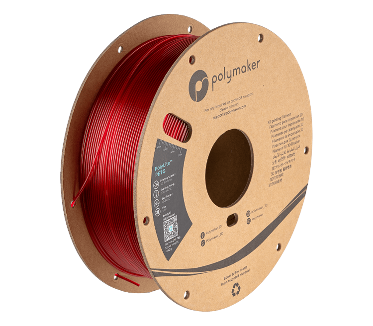 PolyLite™ PETG се навива на картонени макари Polymakers с тегло 1 kg, произведени от рециклиран картон. Изрезката и манометърът за тегло отстрани на шпулата позволяват лесно да се види точно колко филамент е останал за следващия ви проект за печат. Опаковката от рециклиран картон и картонената шпула на PolyLite™ PETG са първата стъпка, предприета към създаването на по-екологично устойчиви продукти. Шпулата е опакована във вакуумирана затваряща се торбичка, за да се гарантира, че филаментът ви не се овлажнява. Подобно на всички други PETG филаменти, PolyLite™ PETG е хигроскопичен, затова препоръчваме да запазите тази торбичка за съхранение на филаментите.
