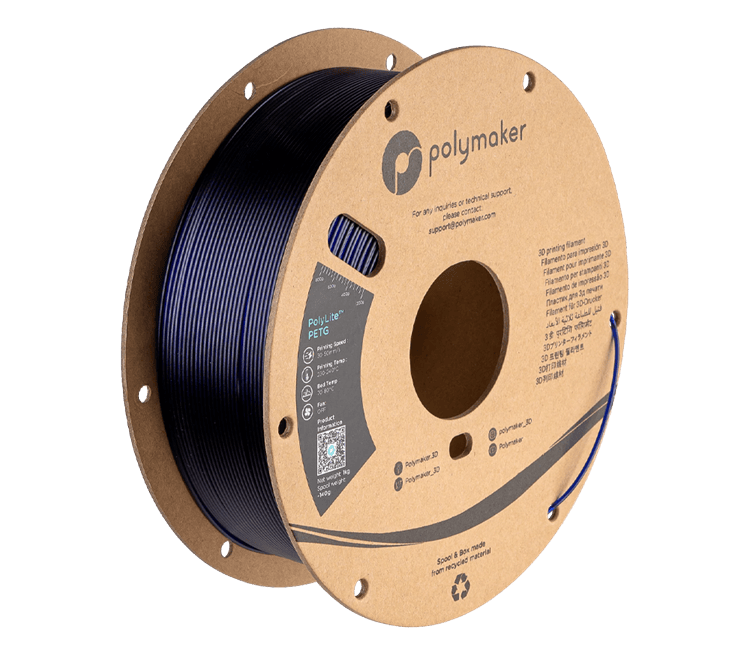 PolyLite™ PETG се навива на картонени макари Polymakers с тегло 1 kg, произведени от рециклиран картон. Изрезката и манометърът за тегло отстрани на шпулата позволяват лесно да се види точно колко филамент е останал за следващия ви проект за печат. Опаковката от рециклиран картон и картонената шпула на PolyLite™ PETG са първата стъпка, предприета към създаването на по-екологично устойчиви продукти. Шпулата е опакована във вакуумирана затваряща се торбичка, за да се гарантира, че филаментът ви не се овлажнява. Подобно на всички други PETG филаменти, PolyLite™ PETG е хигроскопичен, затова препоръчваме да запазите тази торбичка за съхранение на филаментите.