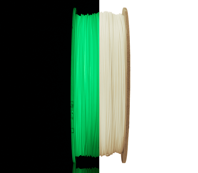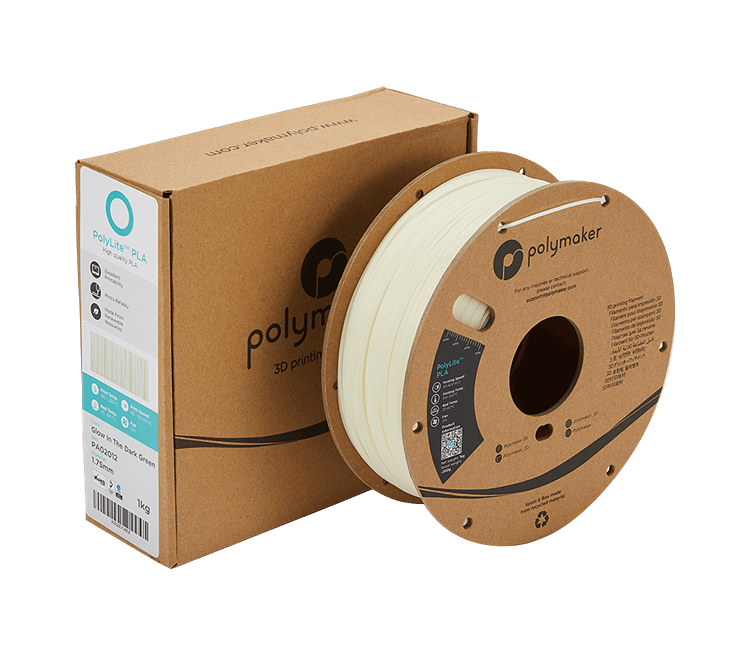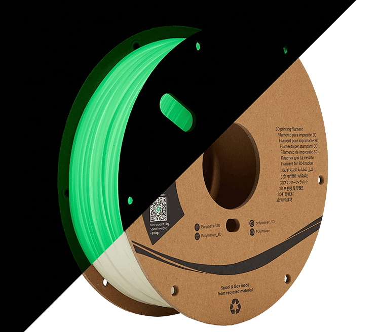 PolyLite™ Glow in the dark PLA е PLA материал със специален ефект, предназначен за отпечатване на забавни и светещи 3D отпечатъци. Светещите в тъмното PLA материали предлагат подобна съвместимост с принтерите, но изискват допълнителни съображения за отпечатване, като например използване на дюза от закалена стомана, за да се предотврати прекомерното износване на принтера.