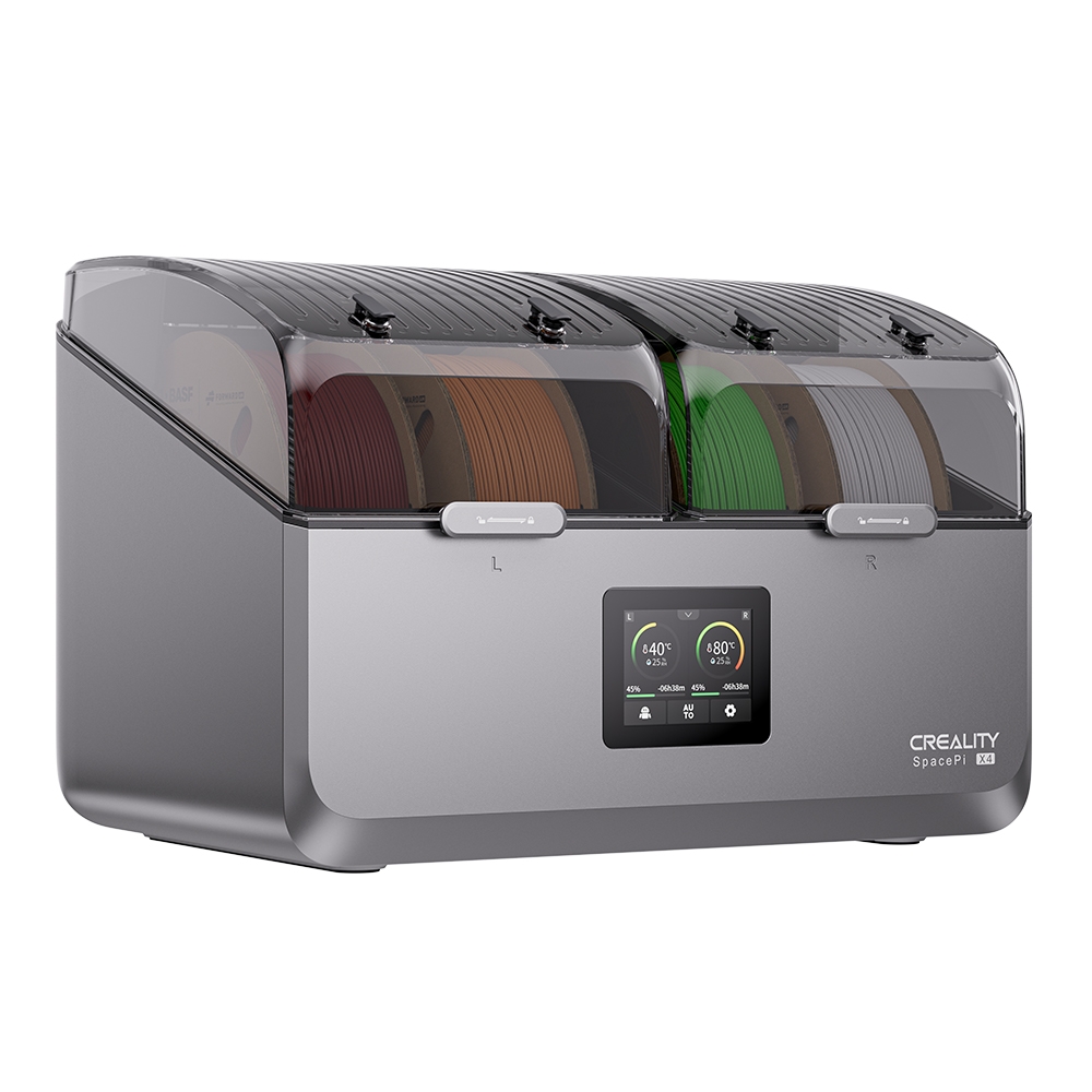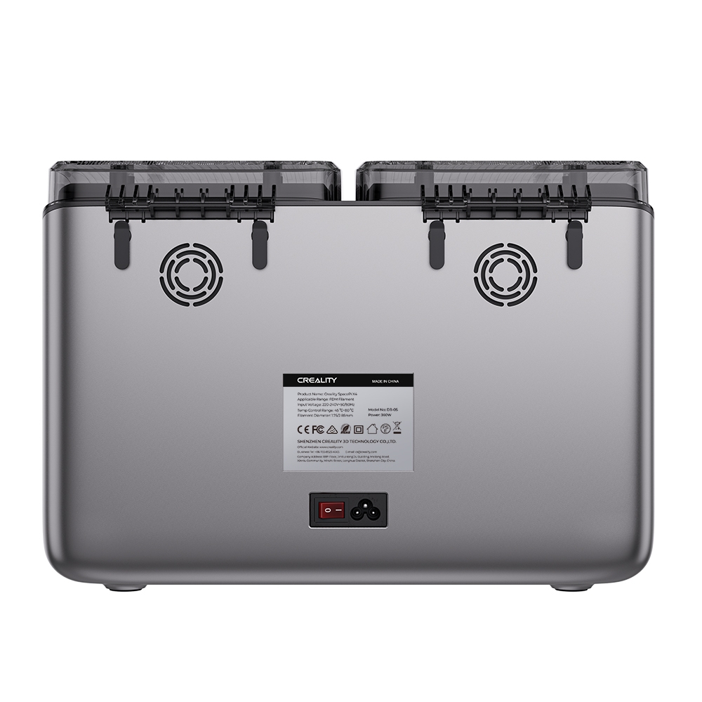 Сушилката за филаменти Creality SpacePi X4 има елегантен и функционален дизайн, способен да побере до четири ролки филамент едновременно. Тя е компактна и лесна за съхранение, идеална както за хобисти, така и за професионалисти. Сушилката е конструирана с мисъл за удобство, предлагайки лесен за използване интерфейс за настройка на температурата и времето.